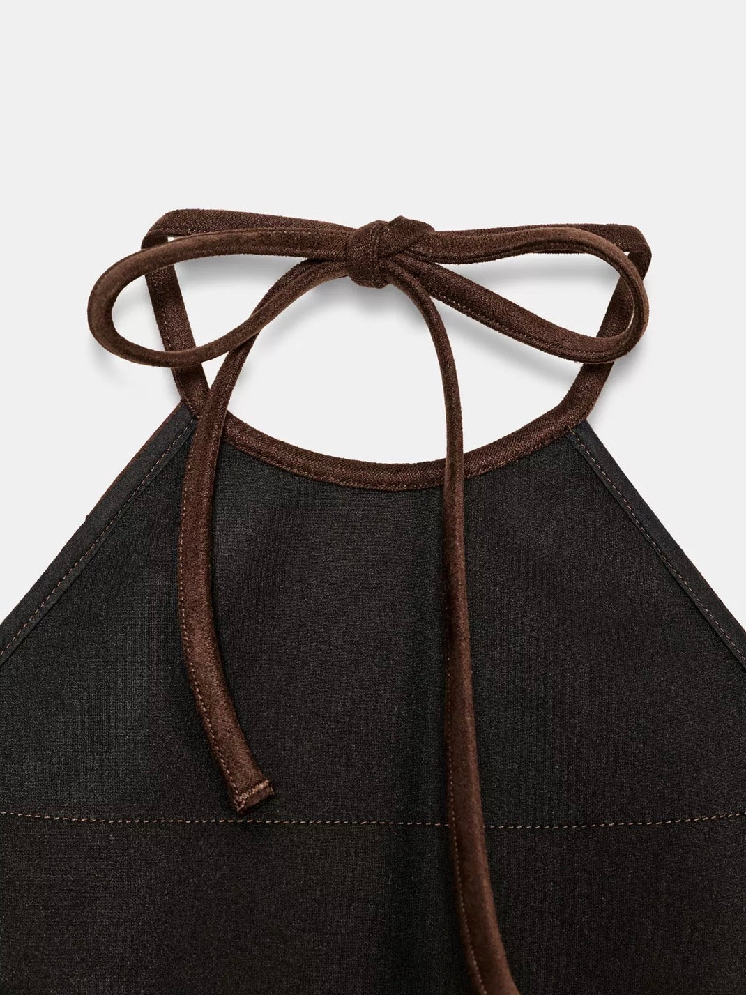 Chic halter top with a neck tie and an alluring bare back. Adorned with exquisite beaded fringe. Features a comfortable elastic back and a discreet side closure with an invisible in-seam zipper.