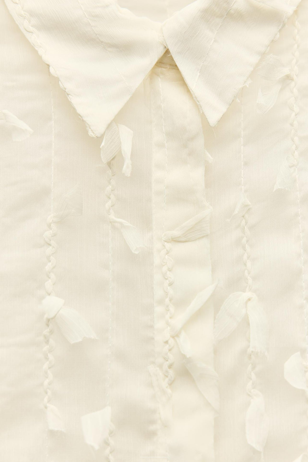 Elevate your wardrobe with this semi-sheer shirt, featuring a lapel collar, long cuffed sleeves, and self-fringe detail. The front button closure completes the stylish look. Crafted with 100% polyester, this shirt is both durable and luxurious. Follow our clothing care guide for best results, including delicate machine washing at 30°C/86°F, avoiding bleach and whitener, ironing at a maximum of 110°C/230°F, dry cleaning with tetrachloroethylene, and no tumble drying.