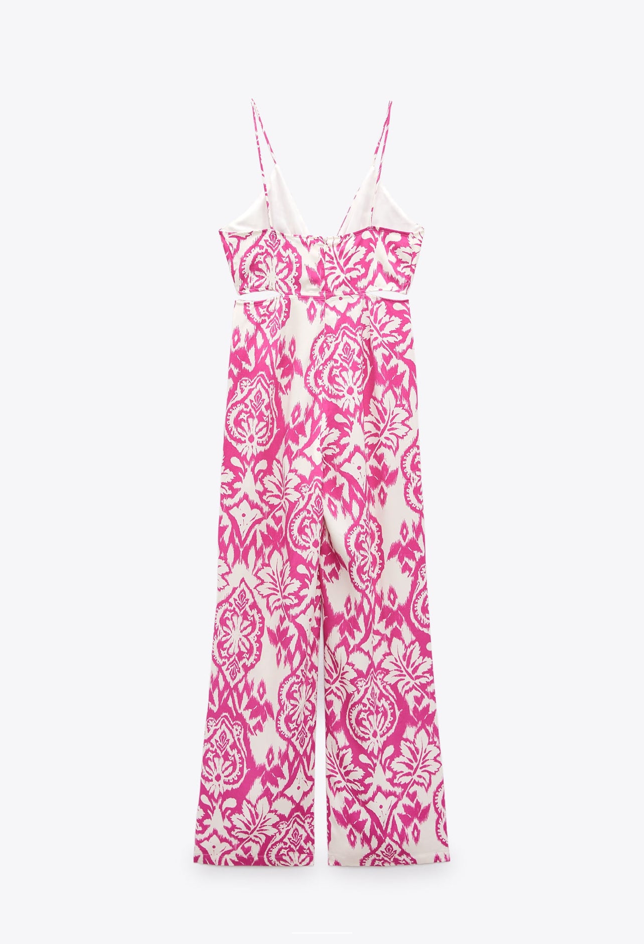 Featuring a ruched V-neckline and delicate spaghetti straps, this jumpsuit also includes side cutouts at the waist for a modern touch. The straight leg design is complemented by a discreet zip closure at the back. Available in pink and white, with a composition of 100% viscose for the outer shell and 100% polyester for the lining.