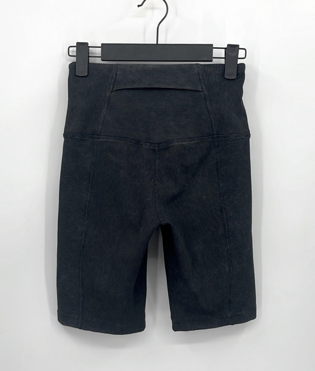 A subtle acid-inspired wash adds lived-in appeal to stretchy ribbed bike shorts with a wide, supportive waistband.